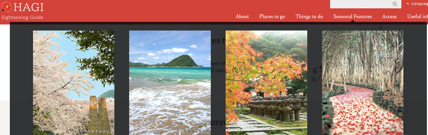 サイト全体の英語の解説文は、正確であり、量的にも観光案内として適切と思います。また、歴史を感じる名所旧跡が多く、街全体にも特有の佇まいがある萩市の魅力が、四季折々の美しい画像やビデオを使いながら、しっかりと伝えられています。世界遺産やジオパークのウェブサイトへのリンクもあり、そちらで詳しい情報も得られます。特産品である萩焼についても分かりやすい説明があり、訪日外国人が楽しめそうな体験型アトラクションも紹介されています。交通アクセス、宿泊施設に関する情報についても、適宜提供されています。